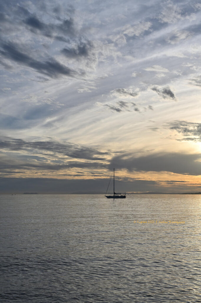 Velero fondea al atardecer